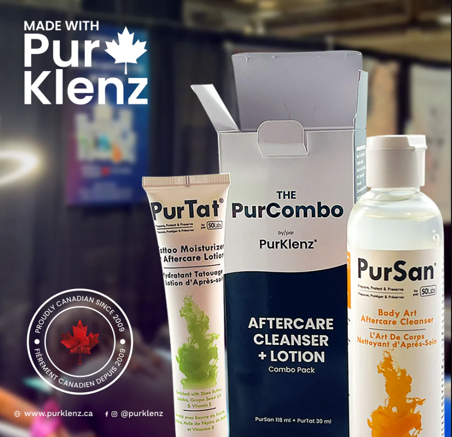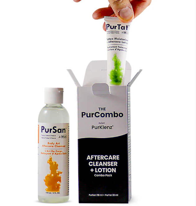 PurTat AfterCare, Enriched with Shea Butter, jojoba, Grape seed oil and Vitamin E, PurTat provides effective skin moisturization to fresh ink and promotes initial and post tattoo aftercare, while helping preserve the vibrancy of the tattoo.
